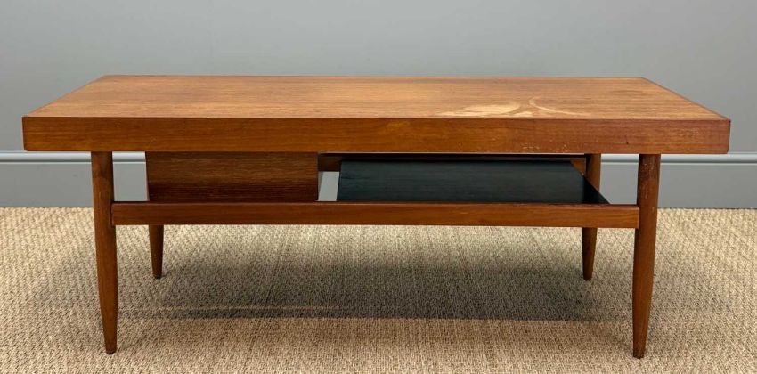 MID-CENTURY WHITE & NEWTON TEAK COFFEE TABLE. sliding top revealing removeable storage box, half-width magazine shelf under, 49 (h) x 127 (w) x 48cms (d)Provenance: consigned via West WalesComments: top stained, two chips to outer edges, otherwise good, inspection advised