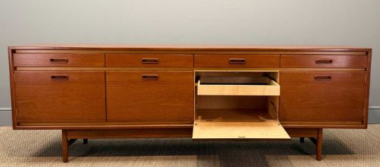 MID-CENTURY WHITE & NEWTON LONG JOHN SIDEBOARD, four frieze drawers with scalloped handles, right with adjustable cutlery tidy, four cabinets below, matching handles, one with removeable serving tray, another with removable bottle caddy, beech lined interior, 78 (h) x 233 (w) x 46cms (d)Provenance: consigned via West WalesComments: very light fading/scratches, good colour, overall excellent, inspection advised