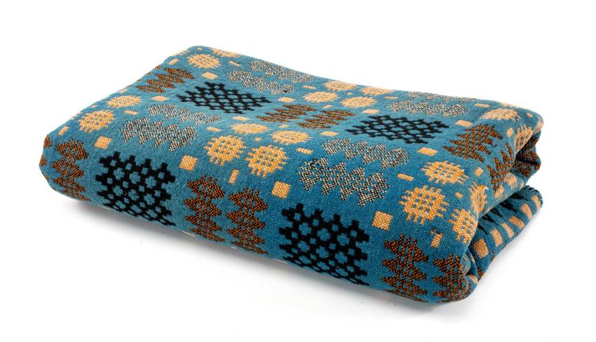 VINTAGE TRADITIONAL WELSH WOOLEN BLANKET with blue, orange and black geometric design, no fringe, 210 x 185cmsProvenance: private collection CardiffComments: no holes