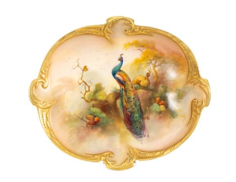 ROYAL WORCESTER PORCELAIN DESSERT PLATE, shape no. H233, painted by Walter Sedgley with a peacock and peahen resting on a gnarled pine tree bough, shaped moulded borders, printed marks, 27.8cms (w)Provenance: private collection CardiffComments: good overall, minor gilt rubbing