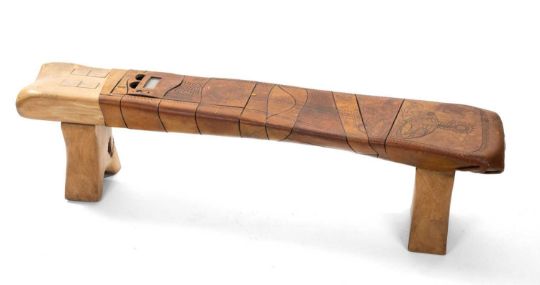 JOHN CLEAL (1929-2007) 'RADIO BENCH' - beech bench part covered with decorated tooled leather, integral 'transistor radio' compartment, 31 (h) x 123cms (w)Provenance: private collection CardiffComments: radio part-removed, some loose leather and small wooden parts, inspection advised