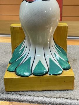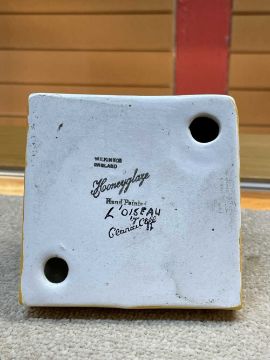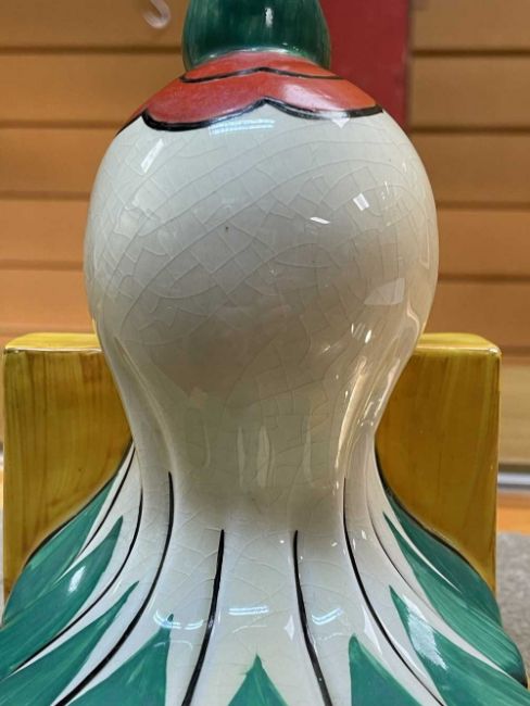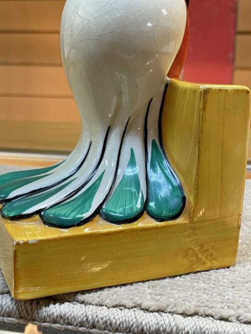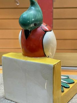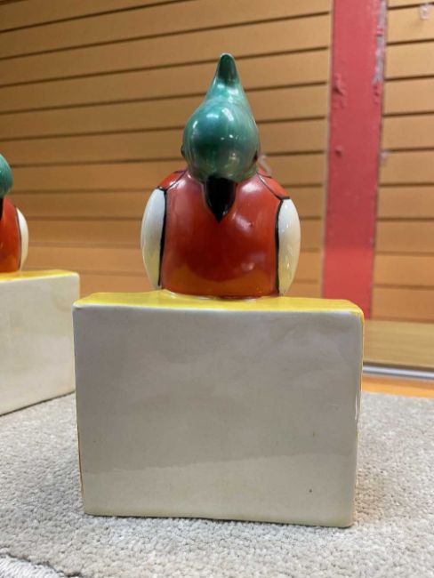 EXTREMELY RARE PAIR OF CLARICE CLIFF L'OISEAU FANTAIL BOOKENDS, Wilkinson pottery, marked to base 'Honeyglaze', 'Hand Painted L'Oiseau by Clarice Cliff', 17.5cms high (2)Provenance: private collection CeredigionAuctioneer's Note: see page 74, plate 42 of "Clarice Cliff" by Peter Wentworth-Sheilds and Kay Johnson, London 1976, purchased from Noel Tovey at major L’Odeon exhibition after they published the first Clarice book, believed to be the pair pictured in the bookComments: appear in very good overall condition, minor paint loss to tip of feathers on head, crazing, light surface wear, viewing recommended