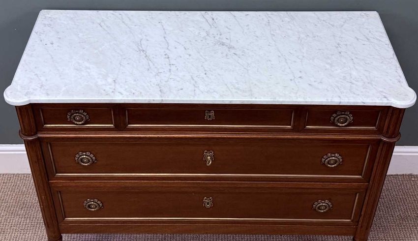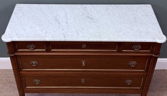 LOUIS XVI STYLE COMMODE CHEST, white marble top over three graduated long drawers, with brass trim and ring handles, tapered turned supports, 85 (h) x 113 (w) x 46cms (d)Provenance: private collection Conwy
