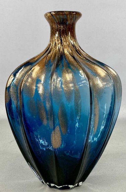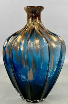 MID-CENTURY GLASSWARE, blue and bronze glass vase, ribbed body and narrow neck, 34cms (h); Scandinavian smoked glass bowl, 15cms (diam.); and another similar, 16cms (diam.)Provenance: deceased estate Conwy