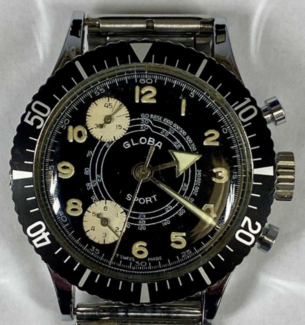 FOUR VINTAGE WRISTWATCHES, Globa Sport chronograph with black bezel and dial, 36mms (diam.), on stainless-steel flexible bracelet; Courbet stainless-steel cased, 34mms (diam.), on military nylon strap; Regence gold plated, and one otherProvenance: private collection Flintshire