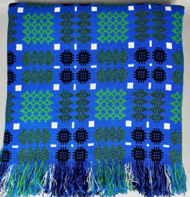 TRADITIONAL WELSH WOOLLEN BLANKET, in blues and greens with tasselled ends, 230 x 230cmsProvenance: private collection Ynys Môn