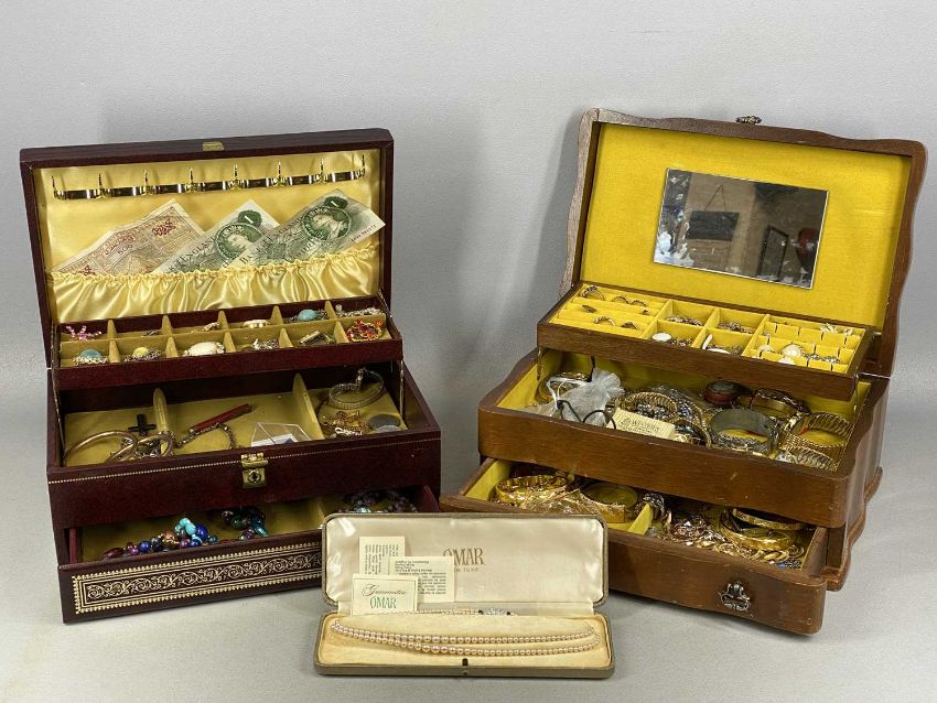 ASSORTED COSTUME JEWELLERY, including rings, earrings, necklaces, and wristwatches, contained within two jewellery boxesProvenance: private collection Conwy