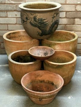 ASSORTED JARDINIÈRES / GARDEN POTS, comprising stoneware garden jardinière, glazed on the outside and moulded with dragon design, 32 (h) x 44cms (diam.); and five various terracotta garden pots / jardinières (6)Provenance: private collection Conwy
