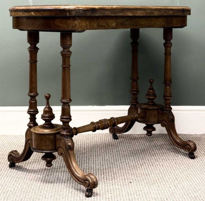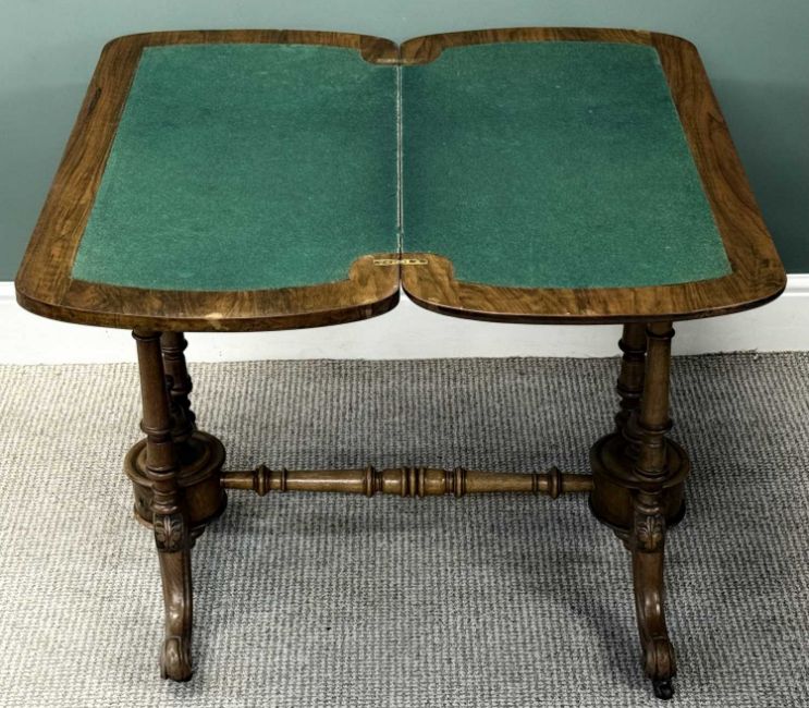 VICTORIAN WALNUT GAMES TABLE, revolving fold-over top with baize lined interior, turned end supports united by a turned stretcher, 71 (h) x 87 (w) x 44cms (d)Provenance: private collection Ynys Môn