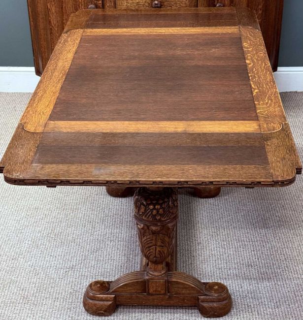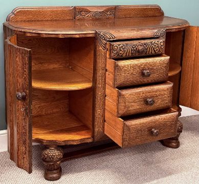 OAK DINING ROOM SUITE, early 20th century, comprising draw leaf table with carved bulbous end supports, four chairs, and sideboardProvenance: private collection Conwy