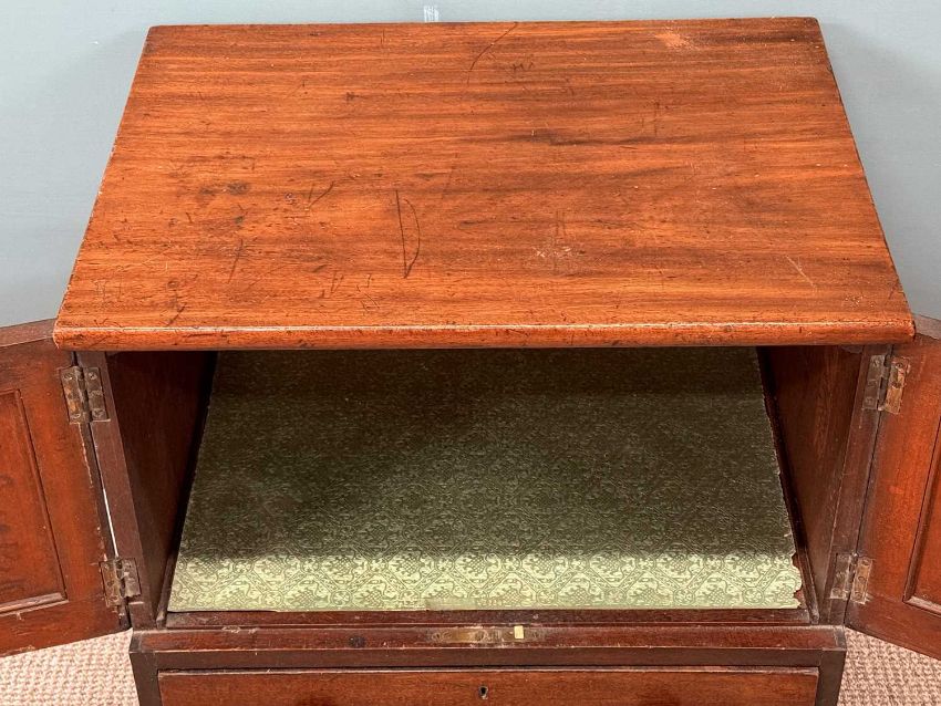 MAHOGANY CUPBOARD, double doors over single drawer of two-drawer appearance, turned knob handles, 77 (h) x 61 (w) x 45cms (d)Provenance: private collection Conwy
