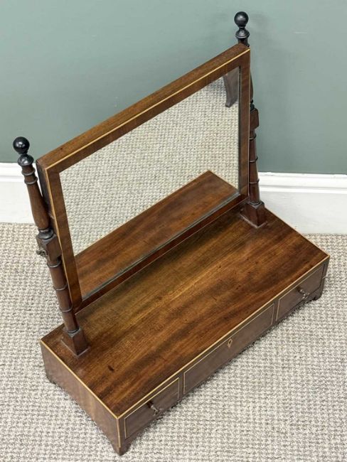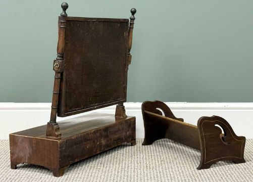 19TH CENTURY MAHOGANY TOILET MIRROR, string inlaid with rectangular plate, turned supports, rectangular base with three drawers, 27 (h) x 51 (w) x 21cms (d); and mahogany bookstand with string inlay, 18 (h) x 41 (w) x 19cms (d)Provenance: private collection Conwy