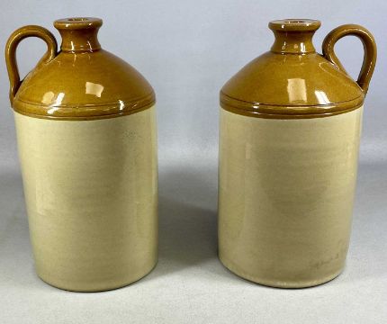 LARGE CIRCULAR TERRACOTTA RED CROCK, glazed interior, 27 (h) x 54cms (diam.); and two stoneware flagons, unnamed, 34cms (h)Provenance: private collection Flintshire