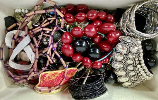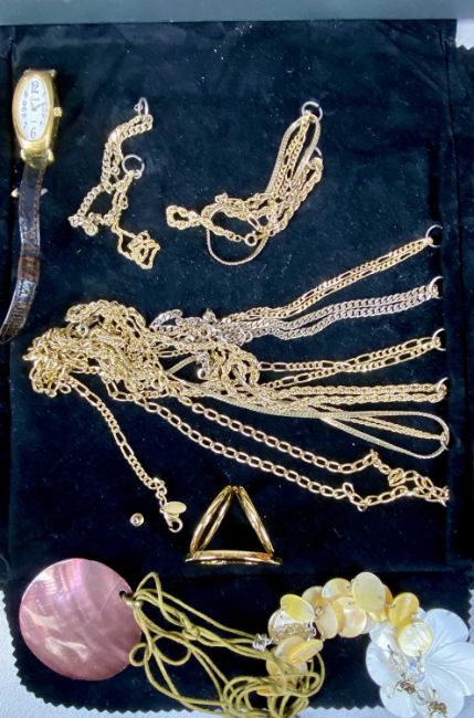 ASSORTED COSTUME JEWELLERY, including quantity of gold tone necklaces, various bead necklaces, wristwatches, bracelets, etc.Provenance: private collection Conwy