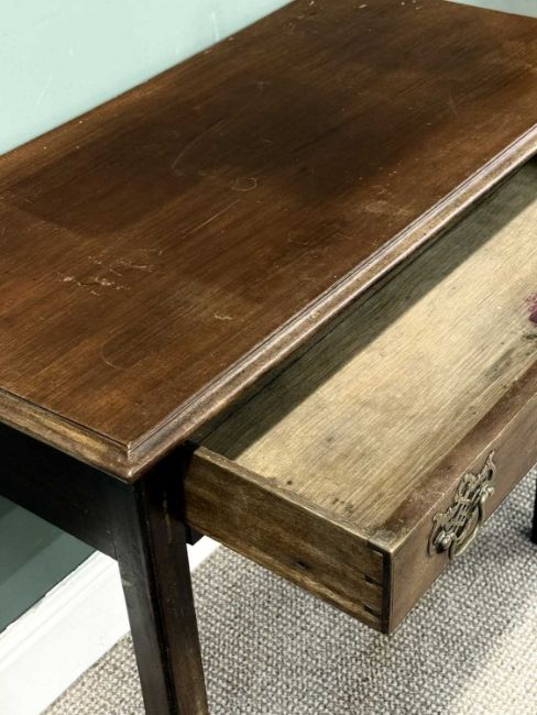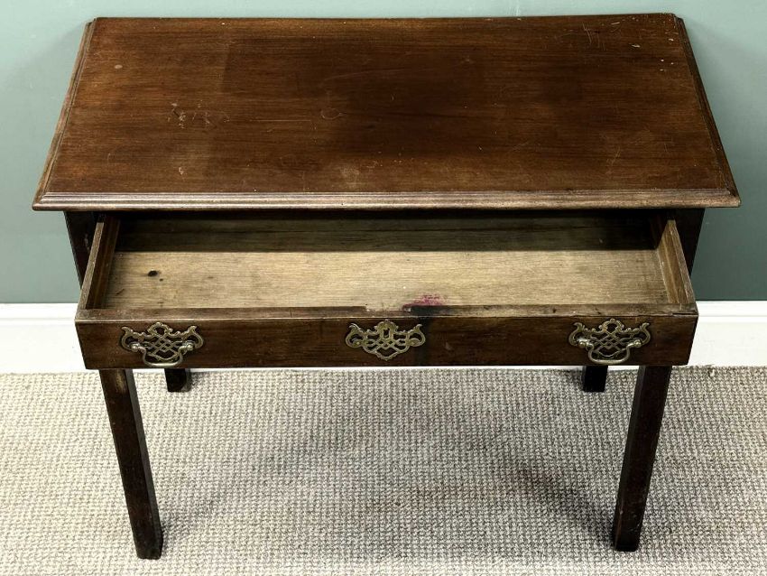 19TH CENTURY MAHOGANY SIDE TABLE, rectangular top with moulded rim, over frieze drawer with brass drop handles, pierced backplates, and escutcheons, plain square supports, 75 (h) x 85 (w) x 42cms (d)Provenance: deceased estate Ynys Môn