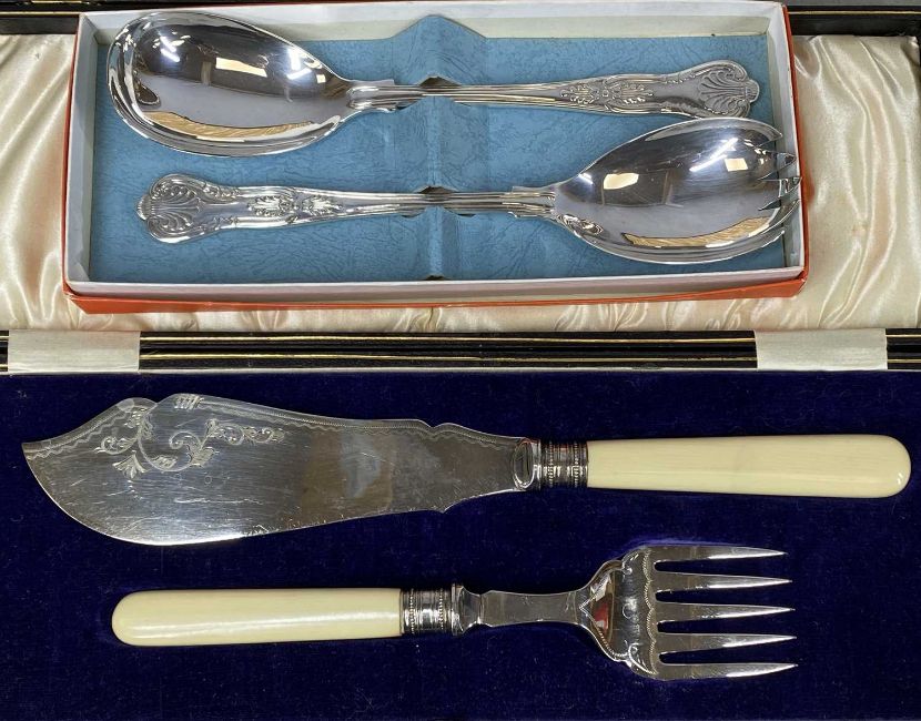 ASSORTED PLATED WARE, including pair of fish servers in box, another pair of fish servers, six cased dessert knives and forks, King's pattern salad servers, circular salver, two tankards, etc.Provenance: private collection Shropshire