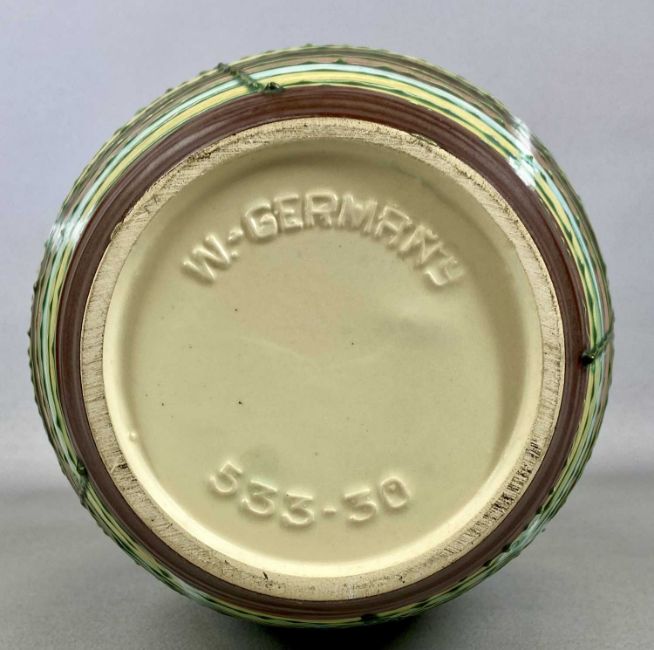 MID-CENTURY GERMAN CERAMICS, Dee-Cee Ges.gesch ewer, geometric banded stripes, impressed marks, no. 236/18; baluster form vase, banded multi-coloured design with raised hoops, no. 533-30, 31cms (h); and ewer with crackle glazed design of vertical stripes, no. 1262-28, 28cms (h)Provenance: deceased estate Conwy