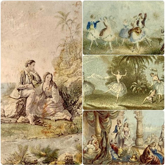 AMENDED DESCRIPTION - 19TH CENTURY BAXTER PRINTS - ballet, 4.5 x 12.5cms, and similar, 4 x 12cms; and another watercolour - lovers, 11.5 x 6.3cms (3)