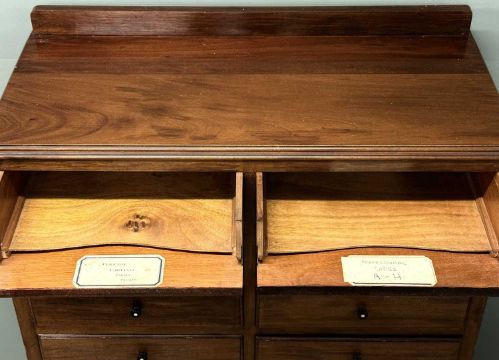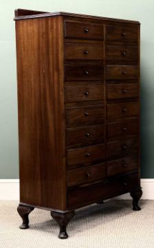 MAHOGANY MUSIC CABINET with raised back, sixteen short and one long drawer, with fall fronts and knob handles, on short cabriole supports, 136 (h) x 85 (w) x 39cms (d)Provenance: private collection Ynys Môn
