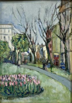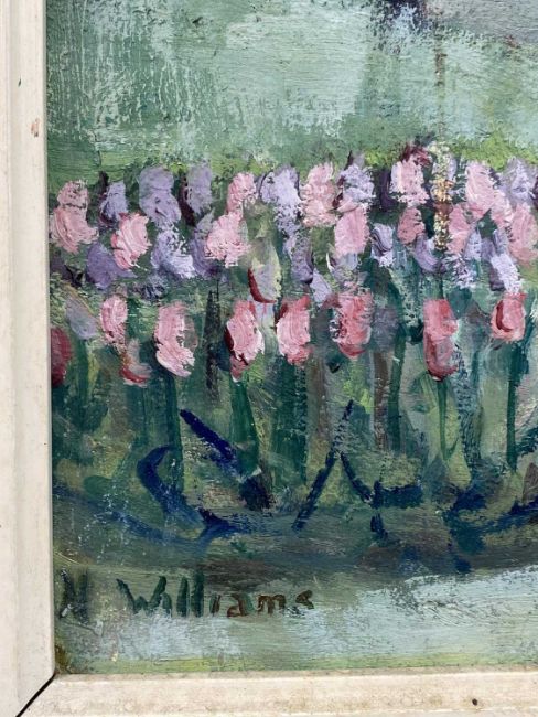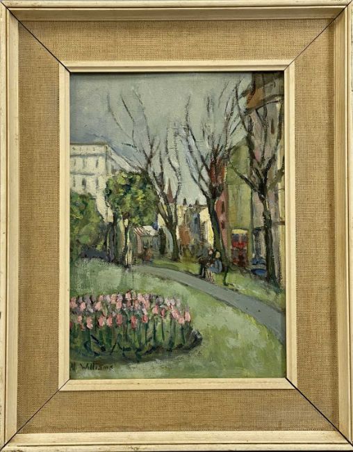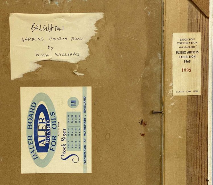 ‡ NINA WILLIAMS oil on board - entitled verso 'Brighton, Gardens, Church Road' on Sussex Artist's Exhibition label 1969, signed lower left, 34 x 24cms; and SALLY BROWN oil on canvas - entitled 'Picture Show', 35 x 45cms (2)Provenance: private collection DenbighshireComments: unframed