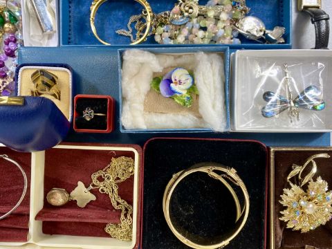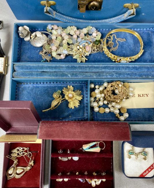 GOOD ASSORTMENT OF COSTUME JEWELLERY, including rolled gold bangle, gilt metal and crystal necklace, gilt metal pearl and stone flower brooch, etc.Provenance: private collection Flintshire