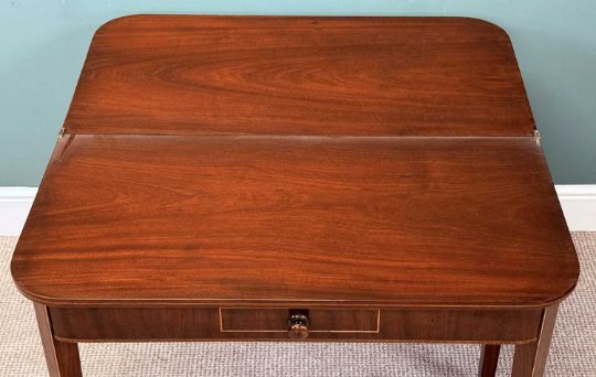 19TH CENTURY MAHOGANY TEA TABLE, string inlay, fold-over top with polished interior, dummy frieze drawer, tapered square supports, 75 (h) x 90 (w) x 45cms (d)Provenance: private collection Conwy