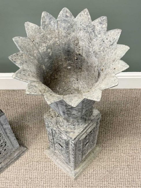 PAIR OF GALVANISED METAL GARDEN URNS of pineapple form, on pierced rectangular stands, 88cms (h)Provenance: private collection Conwy