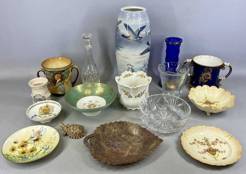 ASSORTED CERAMICS & GLASSWARE, including Bing and Grøndahl Copenhagen vase, decorated with ducks in flight, 40cms (h); Royal Doulton commemorative two-handled tankard, Edward VIII, 16cms (h); Royal Worcester two-handled tankard, cobalt blue and gilded, having panel painted with pheasants in landscape, signed J. Stinton, 16cms (h), etc.Provenance: deceased estate Conwy