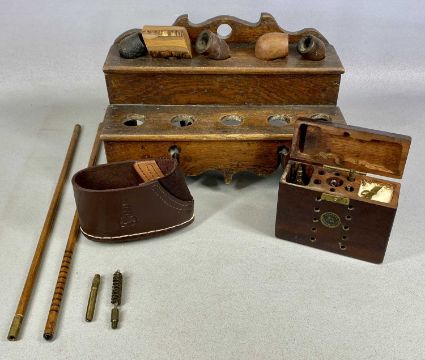 ASSORTED COLLECTABLES, including antique gun cleaning kit in mahogany case, oak pipe rack and contents, shooting sticks, gun cleaning rods, etc.Provenance: private collection Ynys Môn