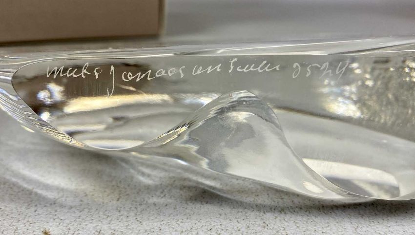 MID-CENTURY GLASSWARE, Whitefriars tangerine bark glass vase, Geoffrey Baxter, 19cms (h); Mats Jonasson boxed dolphin paperweight, 15cms (h); blue and clear glass bird, 22cms (h); and clear glass penguin, 6cms (h)Provenance: private collection Flintshire