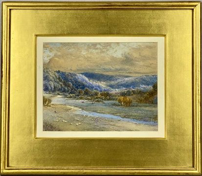 ‡ 19TH CENTURY WELSH SCHOOL watercolour - extensive view over valley, figures, cattle, and sheep in foreground, unsigned, 16 x 20.5cmsProvenance: private collection Conwy