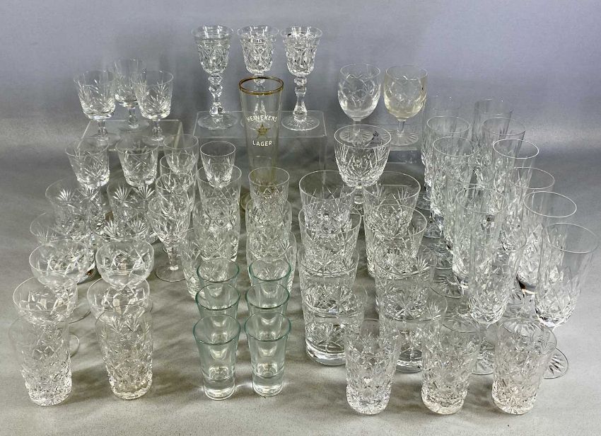 LARGE QUANTITY OF GLASSWARE, including cut-glass champagne flutes and other drinking glasses, various coloured glass paperweights including Mdina, etc.Provenance: private collection Shropshire
