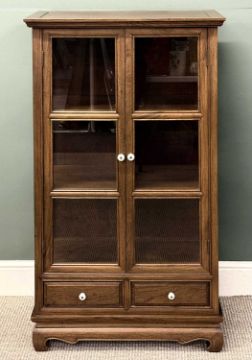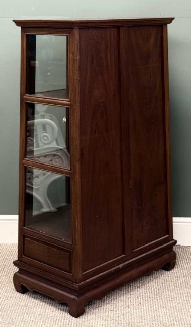 HARDWOOD DISPLAY CABINET, tapered form with glazed doors, shelf lined interior, two drawers to base, 123 (h) x 71 (w) x 41cms (d)Provenance: private collection Denbighshire