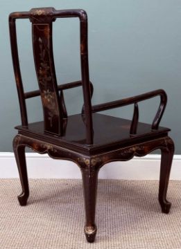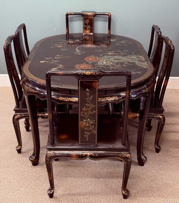 CHINESE BLACK CHINOISERIE DINING SUITE, each piece gilded and painted with flowers, oval table with plate glass top, and six chairs (4+2)Provenance: private collection Conwy