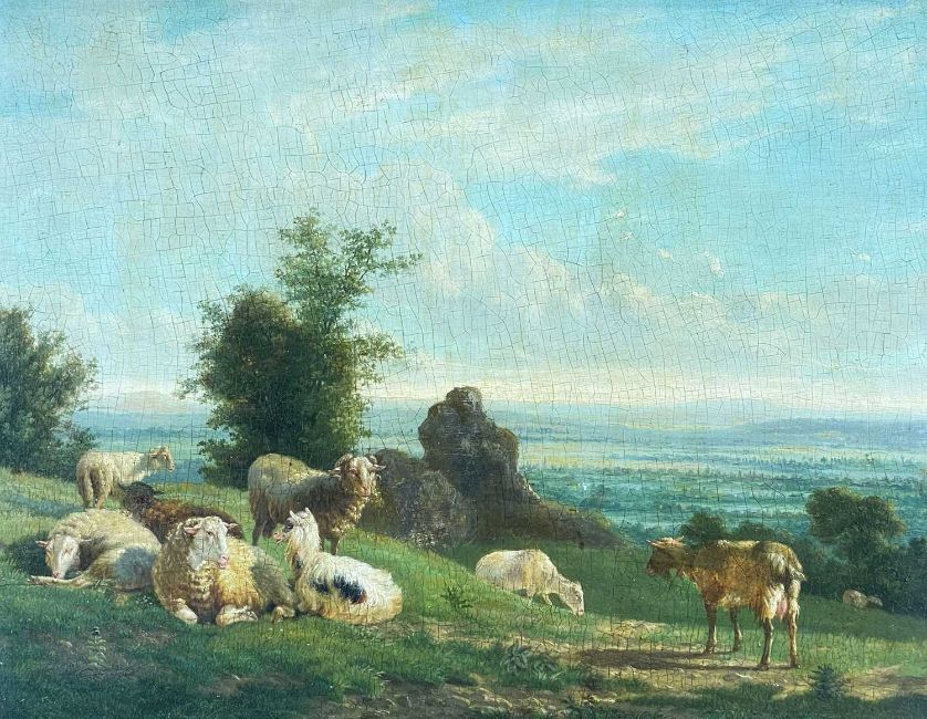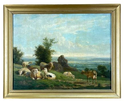 VICTOR-EMILE CARTIER (French, 1811-1866) oil on panel - sheep & goat resting in landscape at dusk, signed and indistinctly dated, 35 x 45cmsProvenance: private collection South WalesComments: Christie's stencil verso, varnish slightly browned, signature and date rubbed, craquelure, some marginal retouching.