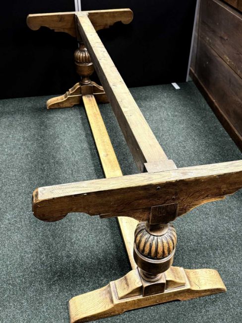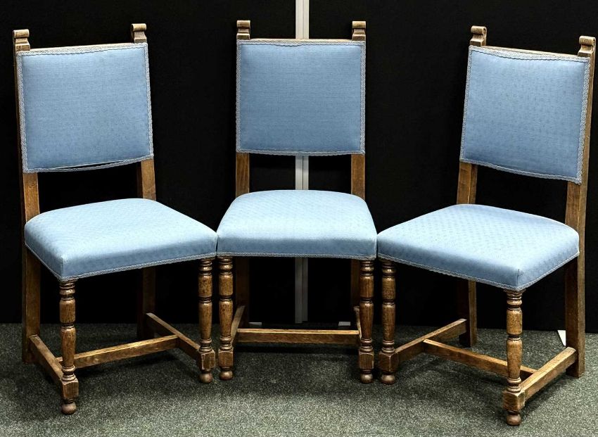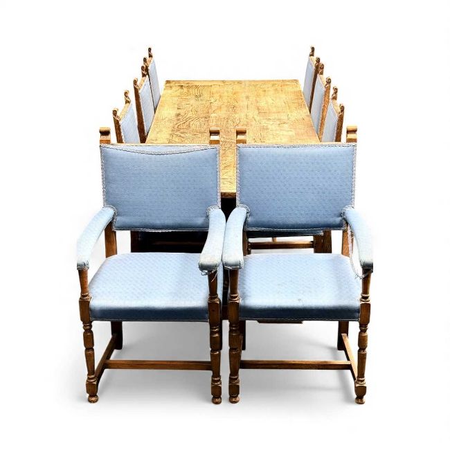 OAK REFECTORY TABLE, rectangular plank top with cleated ends, bulbous turned end supports united by a plain stretcher, 74 (h) x 230 (w) x 91cms (d); and eight chairs (6+2), carvers 101 (h) x 58 (w) x 48cms (d), singles 101 (h) x 48 (w) x 45cms (d)Provenance: private collection Merseyside