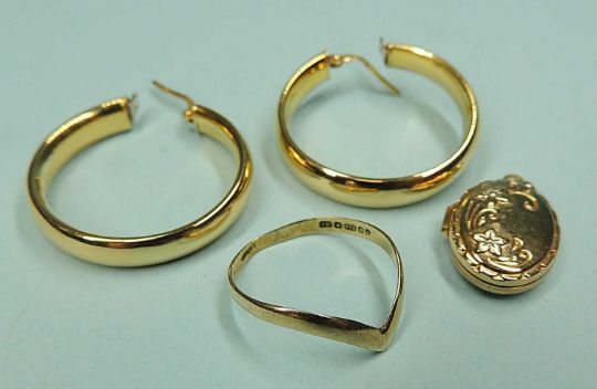 PAIR OF 9CT GOLD HOLLOW HOOP EARRINGS, 22mms (diam.), 4.7g; together with 9ct gold V-shaped ring, 0.9g; and small 9ct gold oval picture locket, 1.3g (4)Provenance: private collection Flintshire