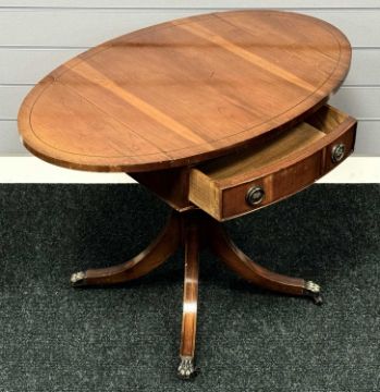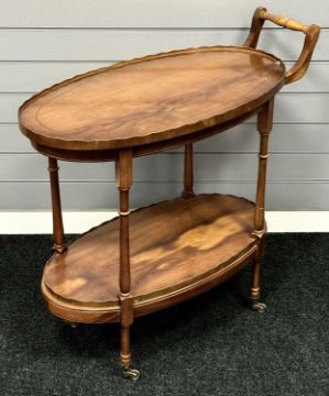 GROUP OF REPRODUCTION FURNITURE including yew wood bonheur du jour, 96 (h) x 42 (w) x 44cms (d); Pembroke table with pedestal support, 56 (h) x 43 (w) x 46cms (d); oval two-tier trolley, 80 (h) x 85 (w) x 42cms (d); drum table, 58 (h) x 49cms (diam.); quartet nest of four rectangular tables, 71 (h) x 50 (w) x 35cms (d); and tripod wine table, 57 (h) x 37cms (diam.)Provenance: deceased estate Wrexham