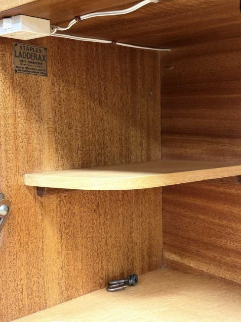 STAPLES LADDERAX MODULAR WALL UNIT, comprising three-drawer chest, cocktail cabinet with illuminated interior, two double cupboards with glazed sliding doors, open shelves, 201 (h) x 275 (w) x 41cms (d)Provenance: private collection Flintshire