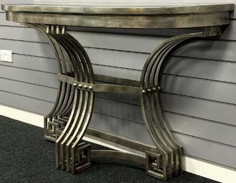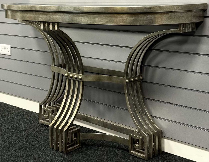 CONTEMPORARY METAL CONSOLE TABLE of demilune form, with silvered finish, the scrolled base with riveted design and Grecian key type terminals, inset plate glass top, 88 (h) x 153 (w) x 47cms (d)Provenance: private collection Cheshire