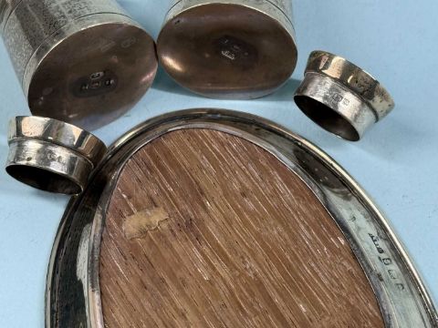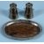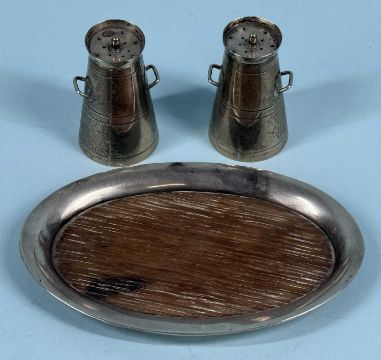 PAIR OF EDWARD VII SILVER MILK CHURN PEPPERETTES, William Dudley, Birmingham 1906, 5.5cms (h); and oval silver pin tray with wooden base, 12.5 x 8cms (3)Provenance: private collection Ynys Môn