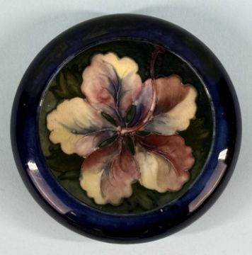 MOORCROFT HIBISCUS PATTERN SHALLOW BOWL, impressed marks, 11cms (diam.); and two Royal Crown Derby paperweights, rabbit and chipmunkProvenance: deceased estate Wrexham