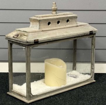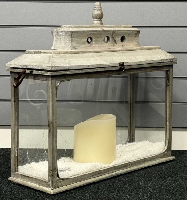LARGE RECTANGULAR LANTERN, distressed wooden finish, glazed to four sides, 60 (h) x 62 (w) x 23cms (d)Provenance: private collection Cheshire