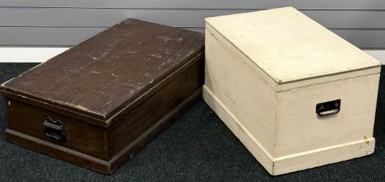 TWO VINTAGE WOODEN TRUNKS, cream painted, the smaller with metal side carrying handles, 40 (h) x 68 (w) x 45cms (d); the other 26 (h) x 88 (w) x 50cms (d)Provenance: private collection Cheshire