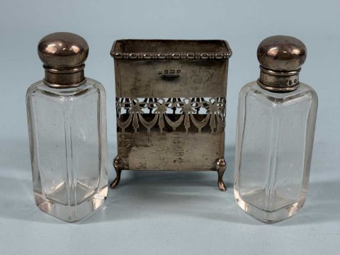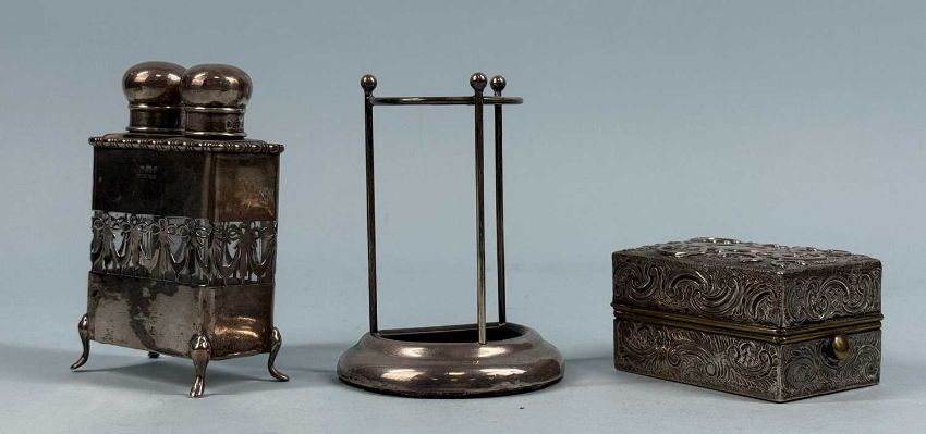 ASSORTED SILVER COLLECTABLES, early 20th century, including rectangular card case engraved with flowers and ferns, hat pin stand formed as an umbrella stand, twin glass scent bottles in silver stand, embossed rectangular box, and circular pin cushionProvenance: private collection Ynys Môn