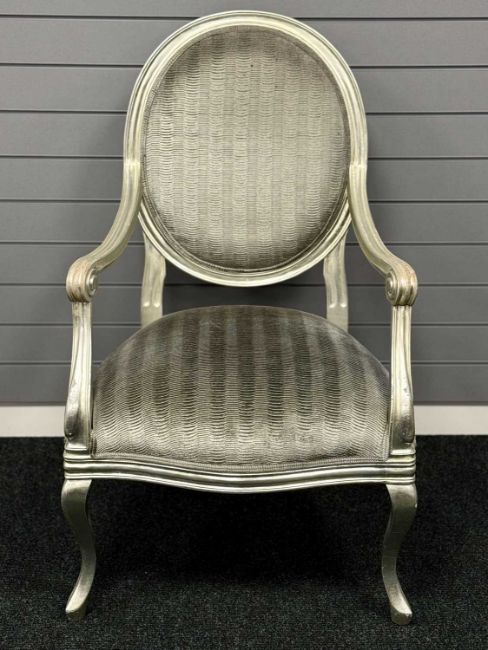 LOUIS XVI STYLE ARMCHAIR, silvered frame, oval back and serpentine seat upholstered in textured silver dralon, cabriole frontal supports, 105 (h) x 62 (w) x 56cms (d)Provenance: private collection Cheshire