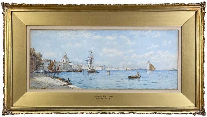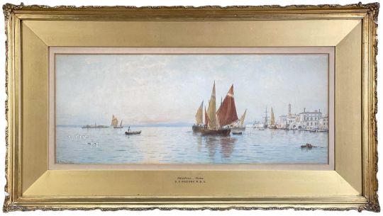 GEORGE STANFIELD WALTERS RBA (British, 1838-1924) watercolours (a pair) - two landscape views of Venice entitled, 'Dogana Di Mare' and 'Pellestrina' both signed, both 23 x 57cmsProvenance: private collection MonmouthshireComments: both similar original frames, both slightly faded, some paper browning