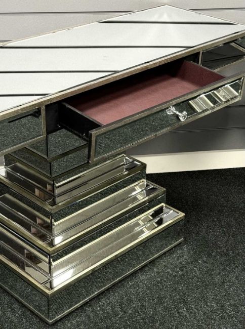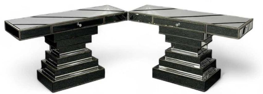 PAIR OF CONTEMPORARY PEDESTAL CONSOLE TABLES, mirrored finish, each having a drawer, 73 (h) x 123 (w) x 41cms (d)Provenance: private collection Cheshire