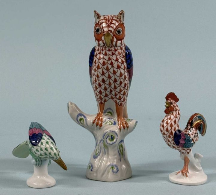 HEREND OF HUNGARY PORCELAIN ANIMAL FIGURES, large pair of rabbits in rust fishnet, 14cms (h); pair of ducks in blue fishnet, 7cms (h); small rooster in rust fishnet, 7cms (h); owl in rust fishnet, 13cms (h); koi carp, 8cms (h); Brazilian blackbird in green fishnet, 5cms (h); and snail in blue fishnet, 4.5cms (h)Provenance: private collection Flintshire