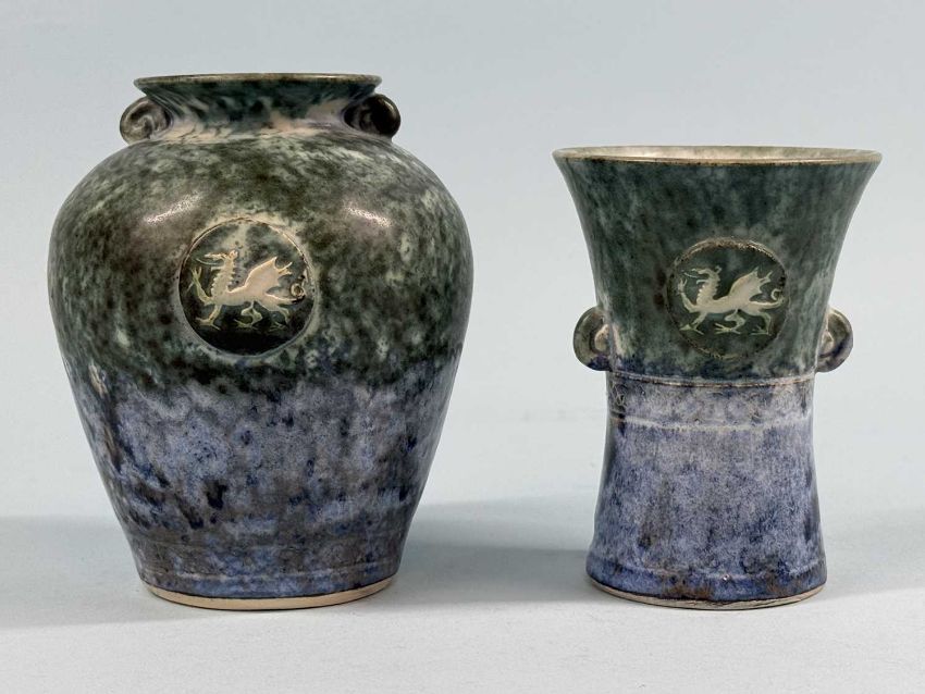 TWO CONWY POTTERY HERITAGE COLLECTION VASES, mottled green and blue with dragon motifs, 13 and 11cms (h)Provenance: private collection Flintshire